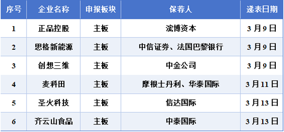 3月8日至3月14日期间正品控股、思格新能源、创想三维、麦科田、圣火科技、齐云山食品向港交所递交上市申请。